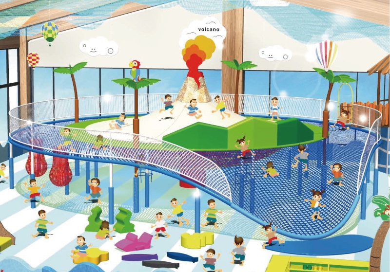これまでキッズパラダイス内に設置していた遊具の中でも最大規模のものとなり、南の海に浮かぶ火山島を模した巨大な屋内アスレチックに設置されたさまざま遊具で、全身使って思いっきりわくわくドキドキの遊びをお楽しみいただくことができます。