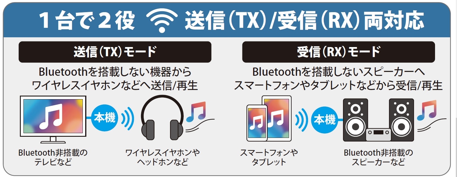 イヤホンジャックに挿すだけで、飛行機の座席モニターやテレビといった音をお手持ちのワイヤレスイヤホンで聴くことができるBluetooth トランスミッター/レシーバーです。送信モード・受信モードの2つのモードに対応しており、Bluetoothを搭載していない機器からワイヤレスイヤホンなどへ送信/再生、Bluetoothを搭載しないスピーカーへスマートフォンやタブレットなどから受信/再生と1台2役でお使い頂けます。モードの切り替えはスイッチ1つで簡単に切り替えが可能です。【送信最大時間:10時間/受信最大時間:20時間】