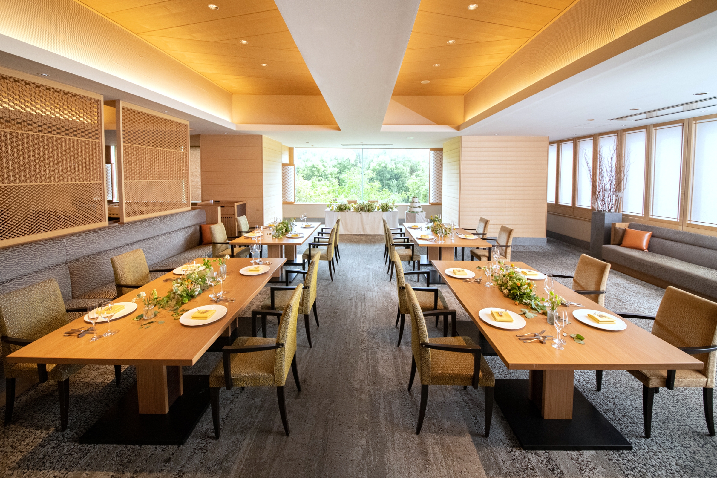山桃や樫・楠・白樫などの常緑樹が中心なので、通年を通して森の緑を背景にリゾートの寛ぎ感を大切にした空間でのお食事会が叶います。