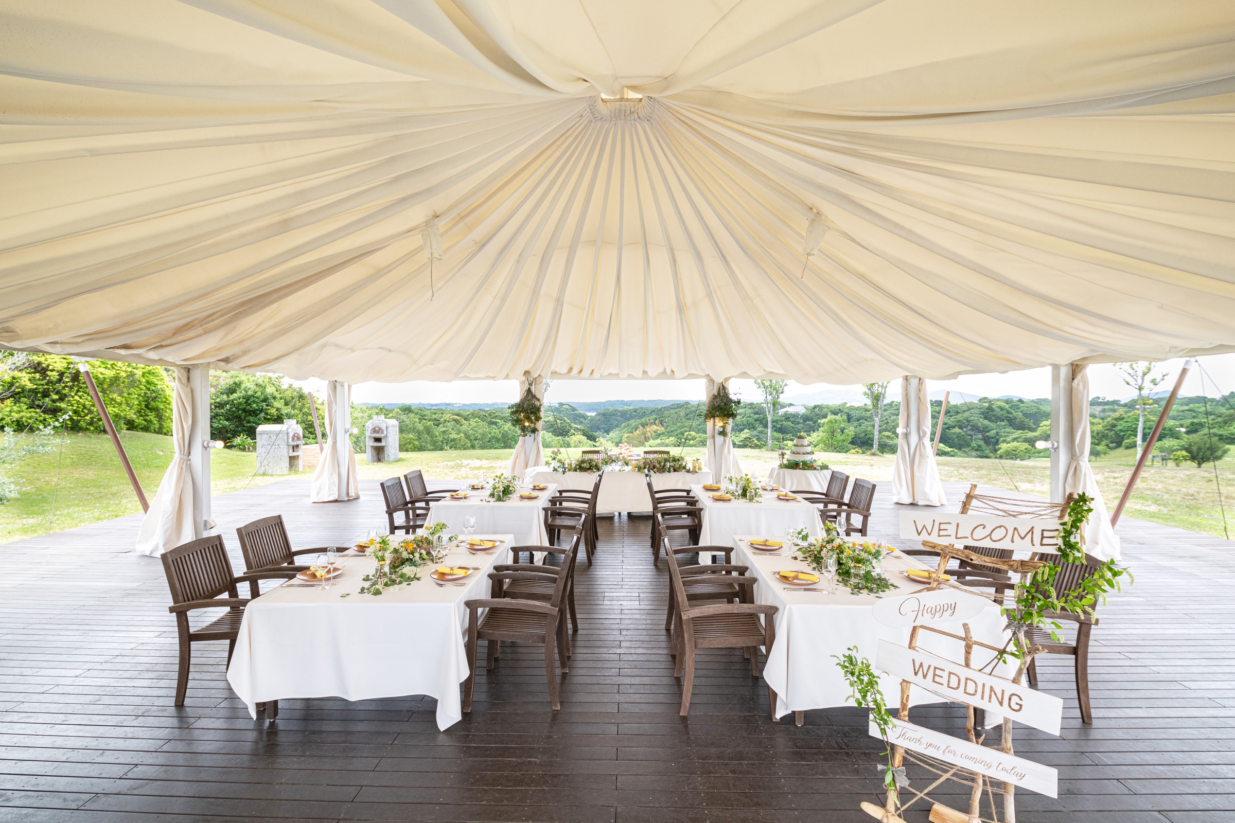 丘の上に建つオープンテント「里山ラウンジ」で、大自然に囲まれながらのお食事会をご用意。