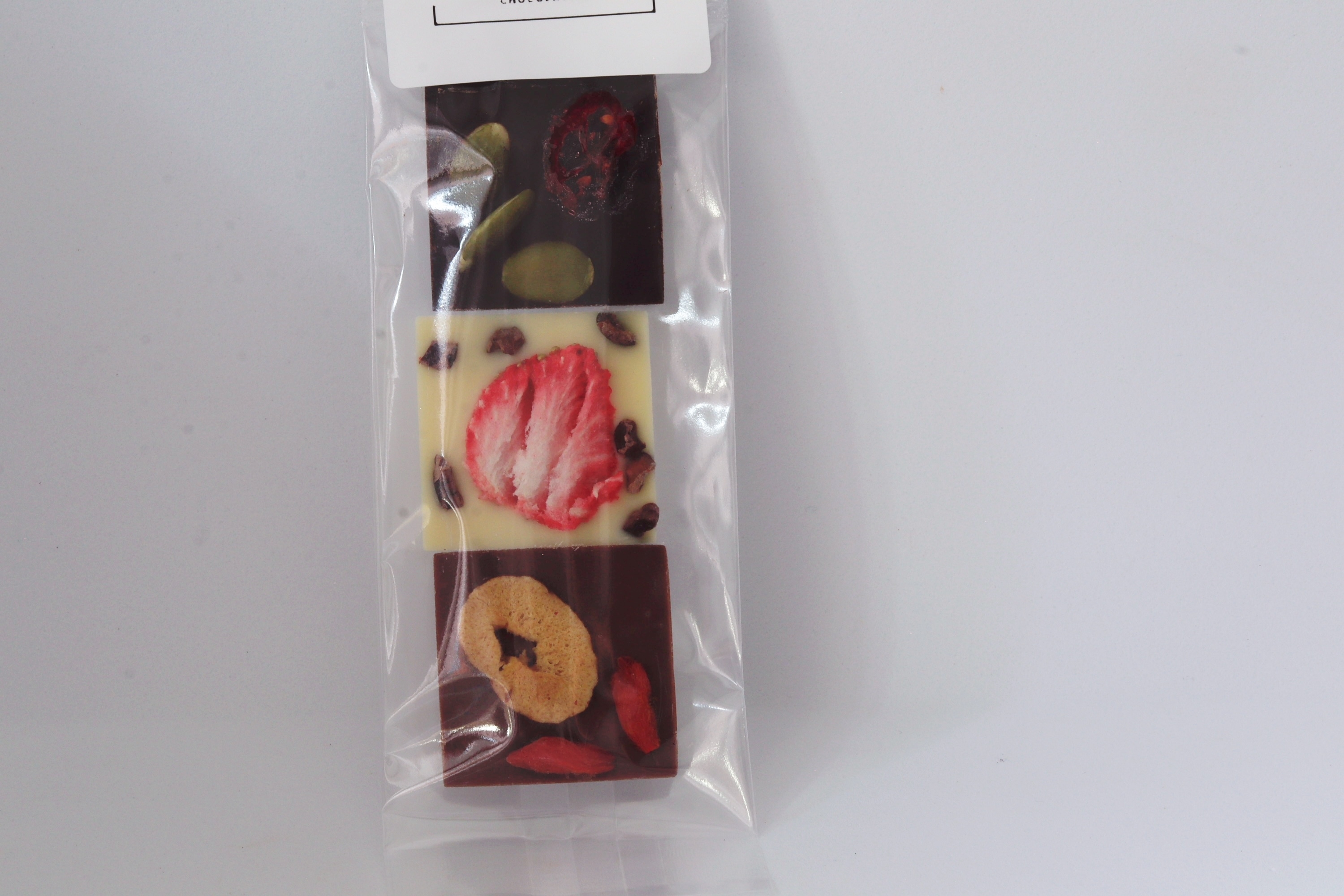 フリーズドライの国産の苺の酸味とカカオニブの苦味のコントラストが楽しいです。