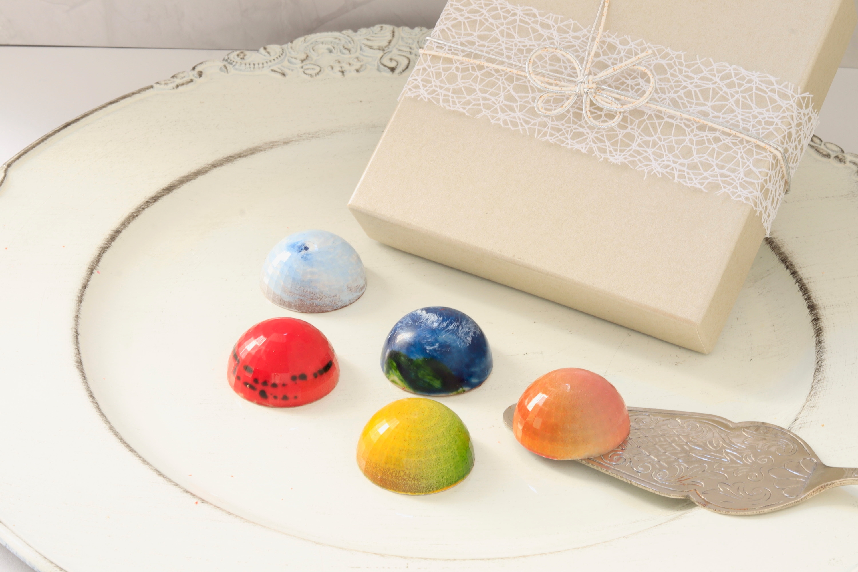 夢をかなえていくためのプロセスをショコラの色使いや、センターに使用する食材のフレーバーで表現しています。ショコラの外観の色や、ショコラそれぞれに使用している食材には意味があるものを使用しています。心の栄養を五感で味わってくださいませ。