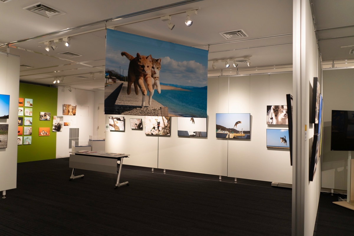 会場内には「飛び猫」や新作を含む約200点の猫写真が展示されています。一般公募した飼い猫の写真を展示する「もふあつめ展」も同時に開催。こちらは約600点もの作品が展示されています。