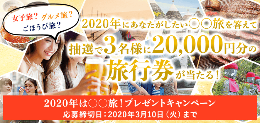 2020年は〇〇旅!プレゼントキャンペーン ~女子旅?グルメ旅?ごほうび旅? あなたがしたい〇〇旅を答えて、 抽選で3名様に20,000円分の旅行券が当たる!~
