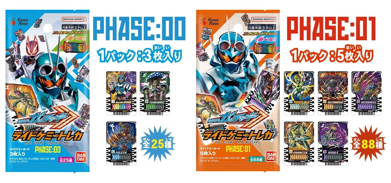 カードパック『ライドケミートレカ PHASE:01』(2023年9月2日(土)発売 220円・税10%込)は、1パック5枚入り 全88種の商品です。本商品でしか手に入れられないラインナップも含まれています。
