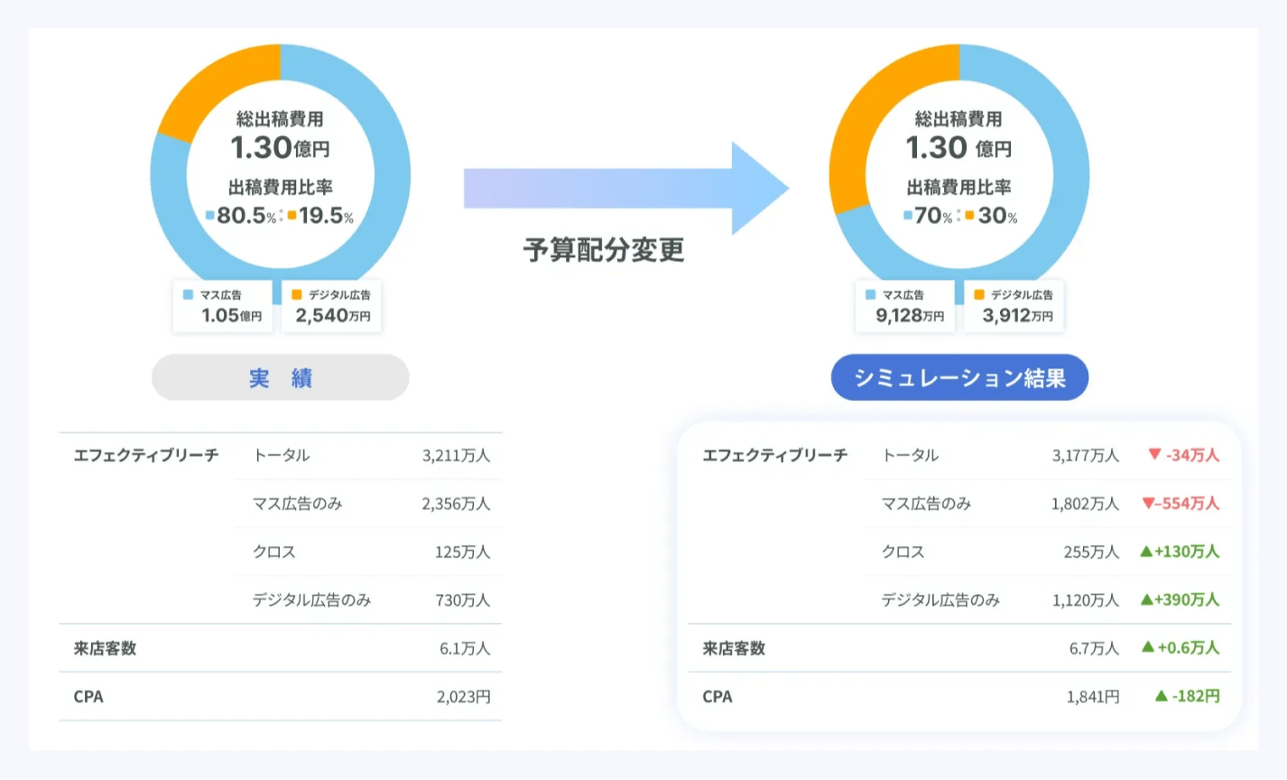 過去の実績データをもとに、テレビCMやデジタル広告の予算配分を変更した際のリーチ人数をシミュレーションできます。複数の配分パターンを比較し、最適なメディアプランの立案を支援します。(※開発中)