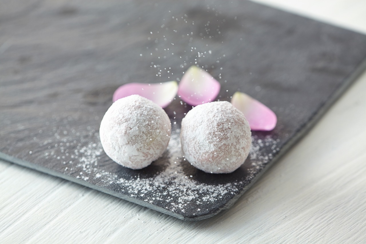 「ストロベリートリュフ」は、水分を飛ばしたフリーズドライ苺をさらにストロベリーリキュールでじっくり煮込んで風味を凝縮。「ローズシャンパントリュフ」は、ハーブティーなどにも多く使用されているローズのペーストに辛口のシャンパンを加えることで、芳醇な香りが口いっぱいに広がります。