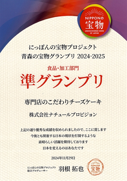 全国に青森の厳選素材を使ったプリンを展開し、生卵の黄身をあとのせして食べる、新しいスタイルのプリン「あおもり生プリン」が人気の『あおもりプリン工房』や、青森県産小麦を使ったこだわりのクロワッサンを提供する『Ailes(エール)』、青森県の食材を中心にこだわりの生パスタ、メディアで話題のふわふわあおもりパンケーキなどを提供する『NATURE CAFE』を運営する、株式会社ナチュールプロビジョン(本社:青森県青森市、代表取締役社長:工藤 真義、以下 ナチュールプロビジョン)は、2024年11月29日(金)の「にっぽんの宝物プロジェクト 青森の宝物グランプリ2024-2025」において、こだわりの素材を使ったチーズケーキ専門店『Melty(メルティ)』から、「専門店のこだわりチーズケーキ」を出品し、食品・加工部門において準グランプリを受賞いたしました!