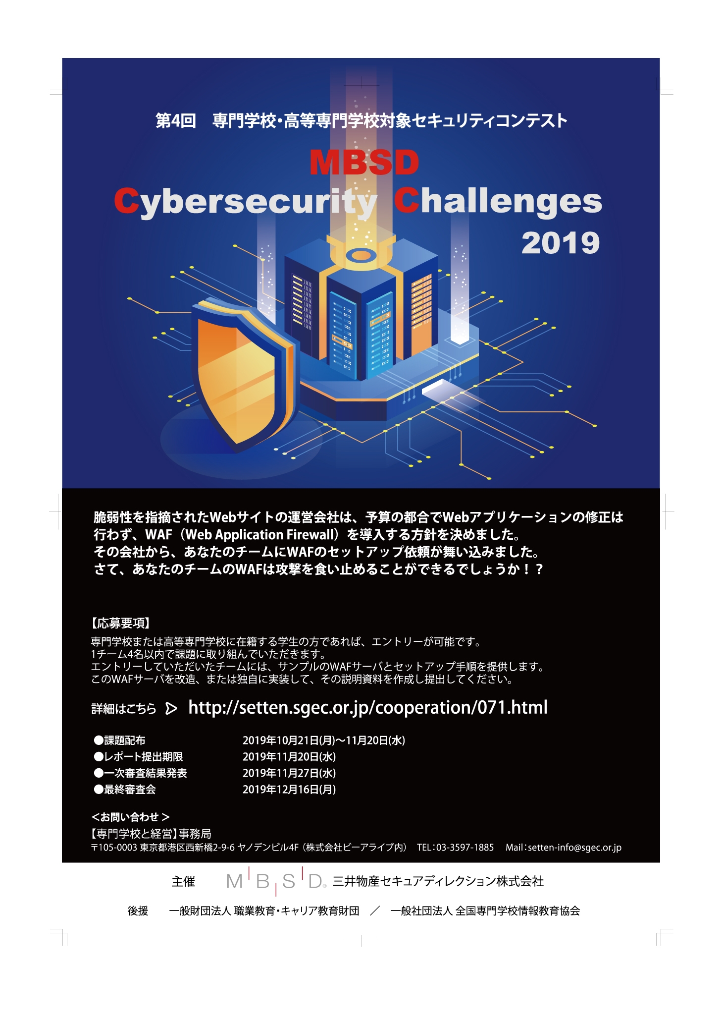 三井物産セキュアディレクション株式会社(本社:東京都中央区、代表取締役社長:神吉 敏雄、以下 MBSD)は、全国の専門学校と企業を繋ぐウェブサイト「専門学校と経営」を運営する株式会社ビーアライブ(本社:東京都港区、代表取締役:米澤 豊)と連携し、学生がセキュリティに興味をもつことを目的に、専門学校・高等専門学校対象 第4回セキュリティコンテスト「MBSD Cybersecurity Challenges 2019」を開催いたします。第4回の課題は、脆弱性を指摘されたWebサイトに、WAFを導入してサイバー攻撃を食い止めることです。