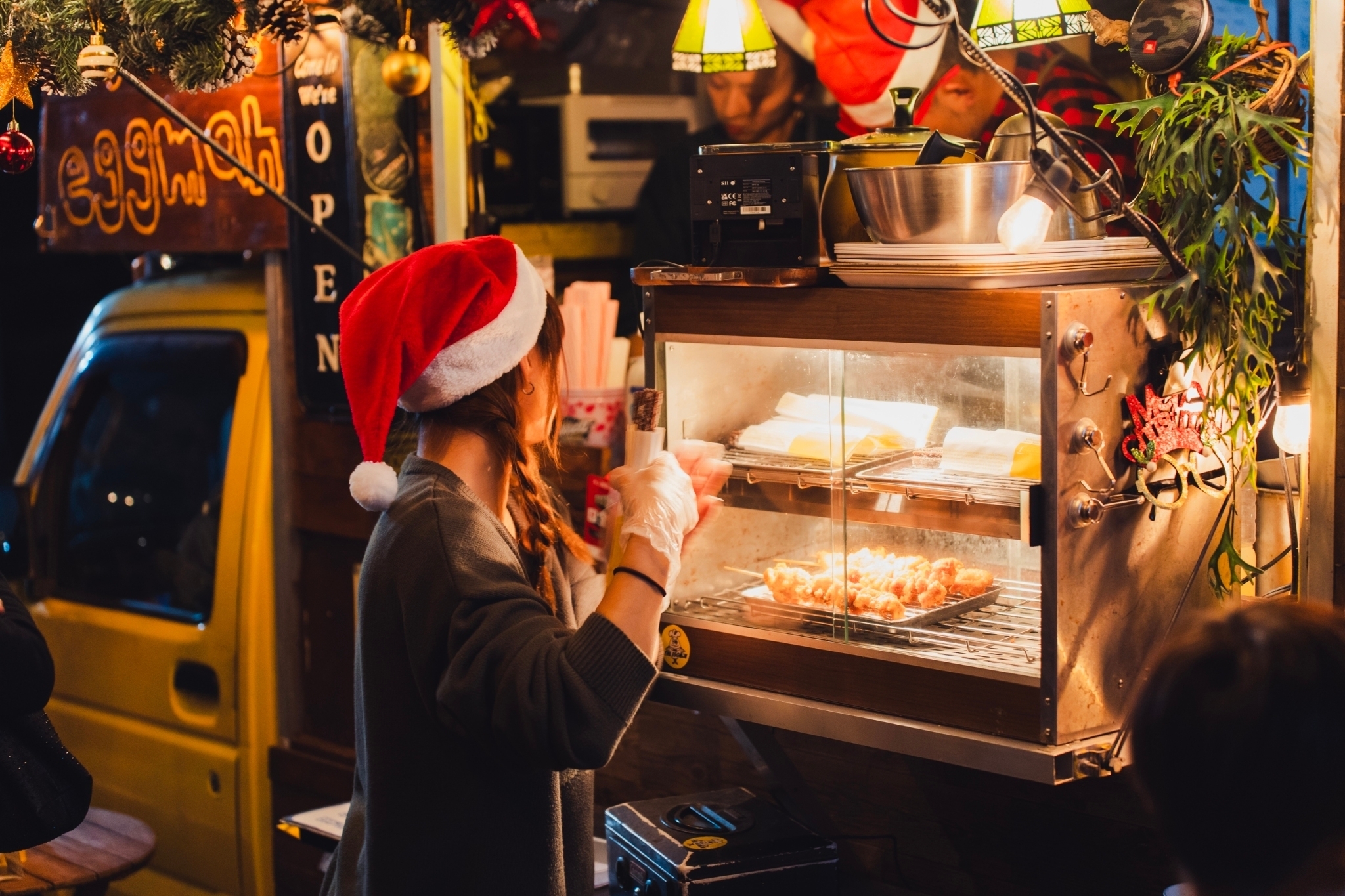 クリスマスマーケットは、12月7日(土)・8日(日)・14日(土)・15日(日)・21日(土)・22日(日)の6日間開催。ハンドメイドや輸入雑貨など、クリスマス関連の商品を販売しています。また、フードトラックも毎回8台以上出店し、クリスマスに夜に相応しいフードが提供されます。