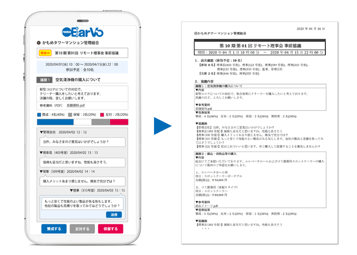 専用サイトで協議・投票された内容は、期間終了後に「事前協議・投票録」としてPDF出力され、主催者のメールアドレスに届くので、PDFファイルをそのまま本会合で印刷配布・画面共有することが可能です。