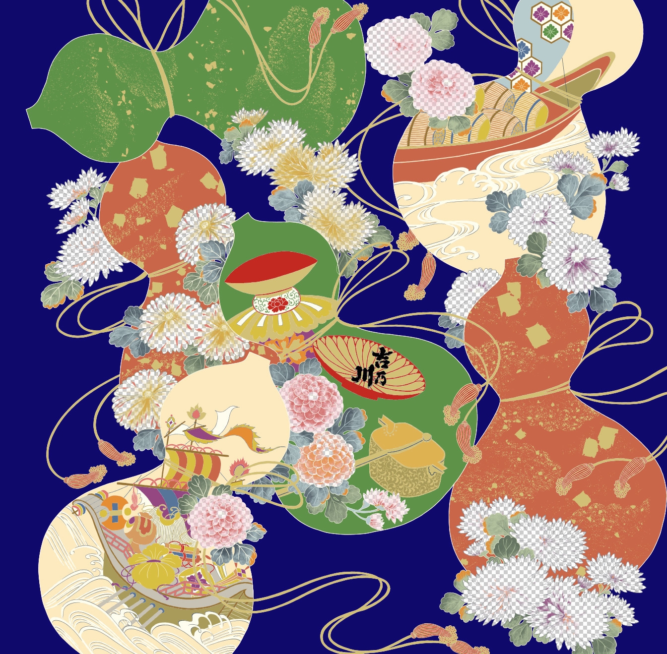 ボトルデザインは吉乃川とも深いつながりがあり、同様に長い歴史を持つ京友禅着物「千總(ちそう) http://www.chiso.co.jp/ 」が手掛けました。また、47,000円版には千總デザインのオリジナル風呂敷(正絹)が同梱され、一層豪華でプレミアムな記念酒となります。(風呂敷は47,000円版のみ)