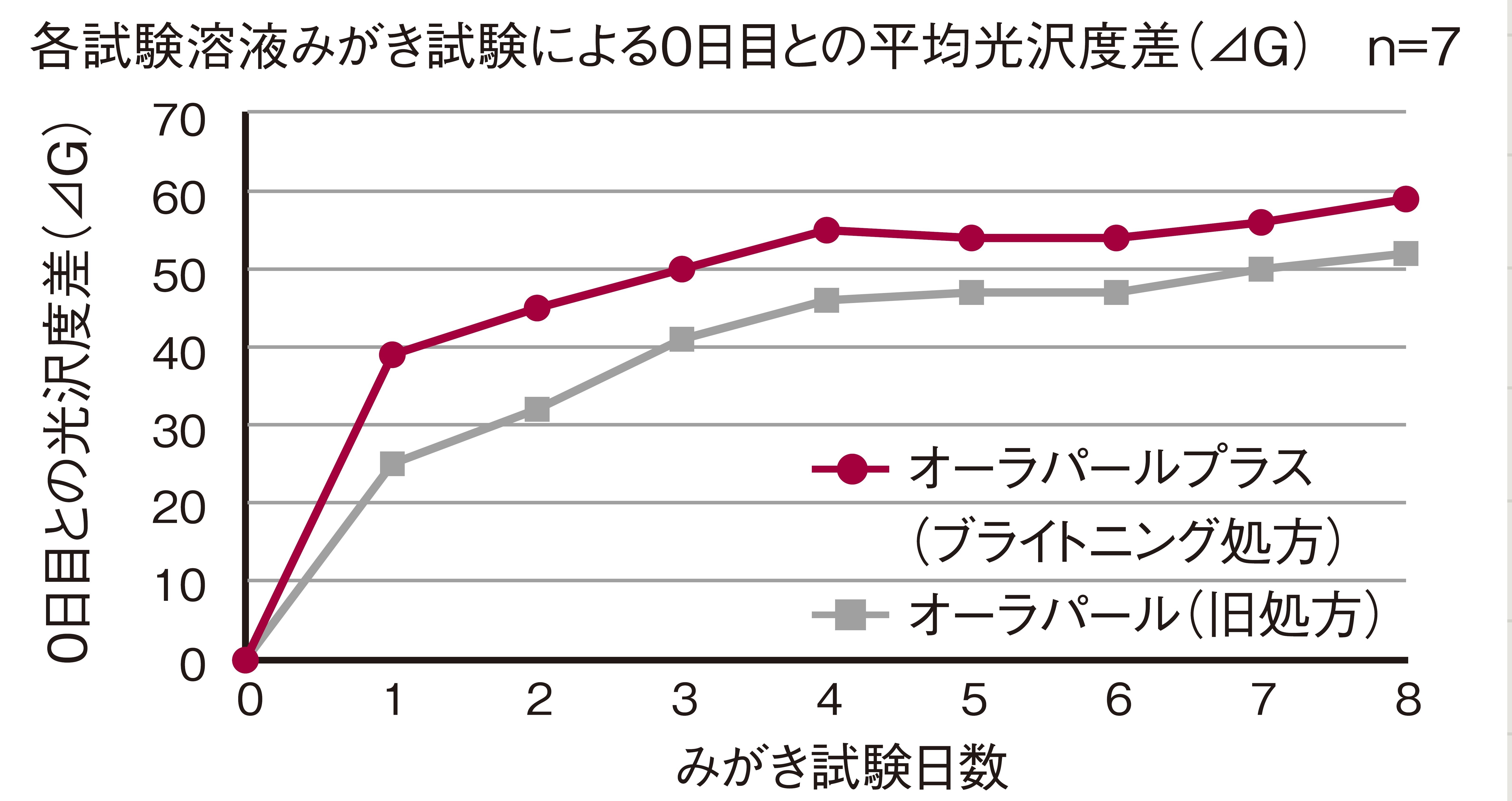 表面に傷をつけた人の歯をナノ粒子薬用ハイドロキシアパタイト配合のオーラパールプラス溶液と無配合の歯磨剤液に7日間浸し、表面の粗さの改善状態を比較したところ、オーラパールプラス溶液に浸した歯の方が、歯の表面がなめらかになっていることが確認されました。