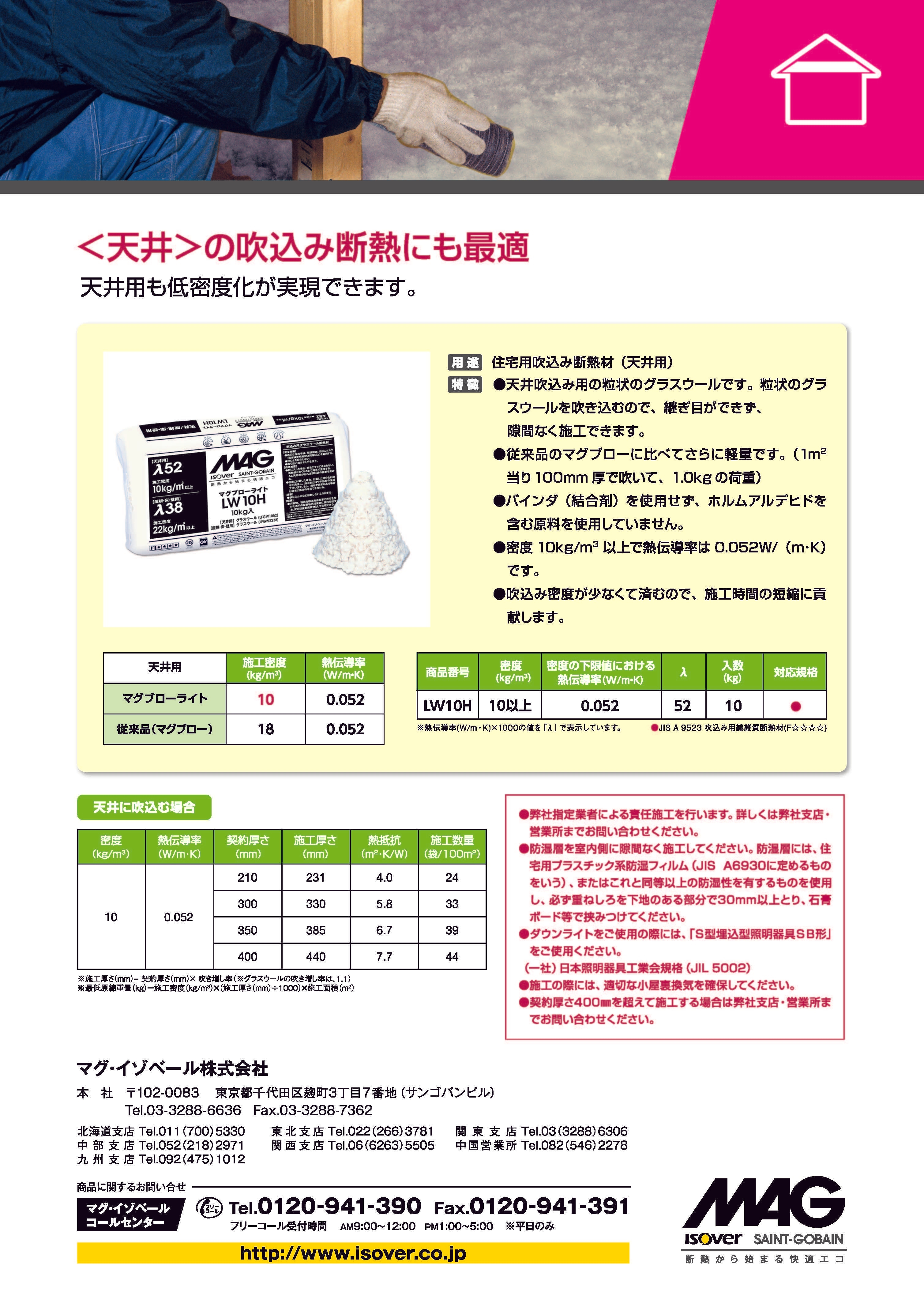 「マグブローライト」は屋根・床・壁、さらに天井にも施工できる、吹込んで使用する粒状のグラスウール断熱材で、低密度でありながら高い断熱性能を発揮します。ブローイングを施す際、従来品と比べ密度を低くできるので施工時間が短縮でき、断熱材の重量も軽くなるので躯体への負担を減らすことができます。屋根・床・壁用は、従来品と同じ吹込み厚さで断熱性能がアップします。コンセントボックスの裏側などの凹凸部分や配管部分、あるいは筋交い部分等、どんな形状の部位にも隙間ない施工が可能で、さらに経年による断熱材の沈み込みが生じにくいので特におすすめです。天井でご使用の場合、1m3当たり10kgと従来品より軽くなりました。