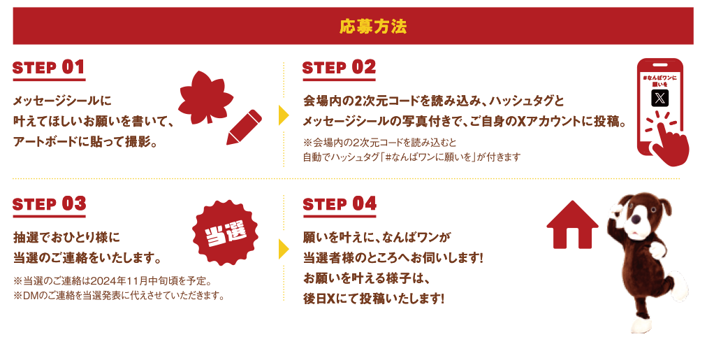 お願い事の写真を撮影し、ハッシュタグをつけてXに投稿いただいた方の中から抽選でおひとりの願いをなんばワンが叶えに行きます!