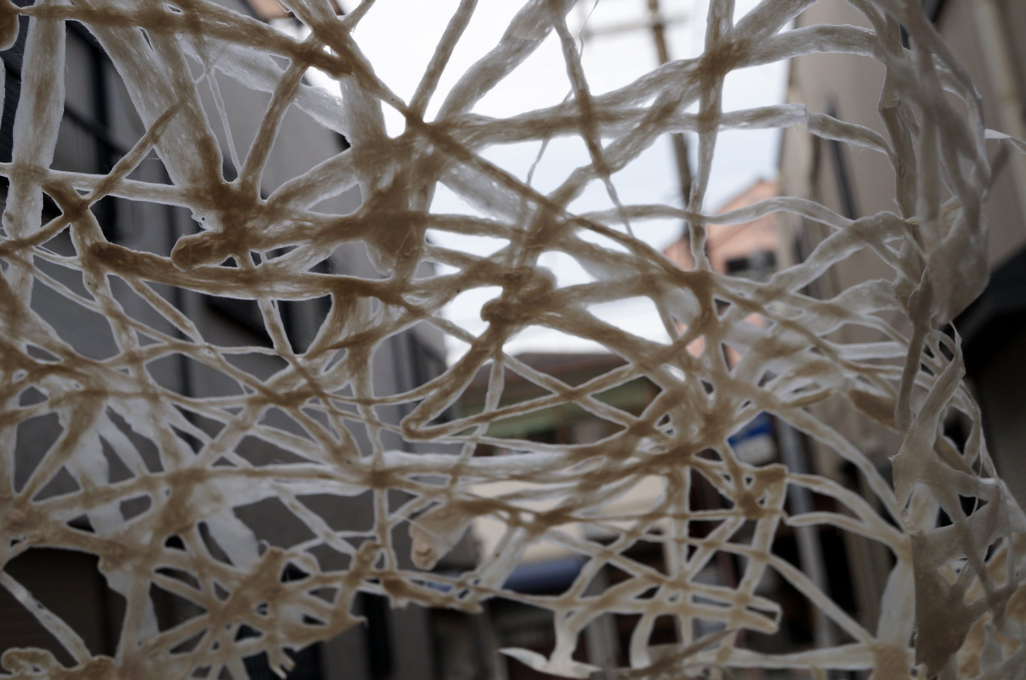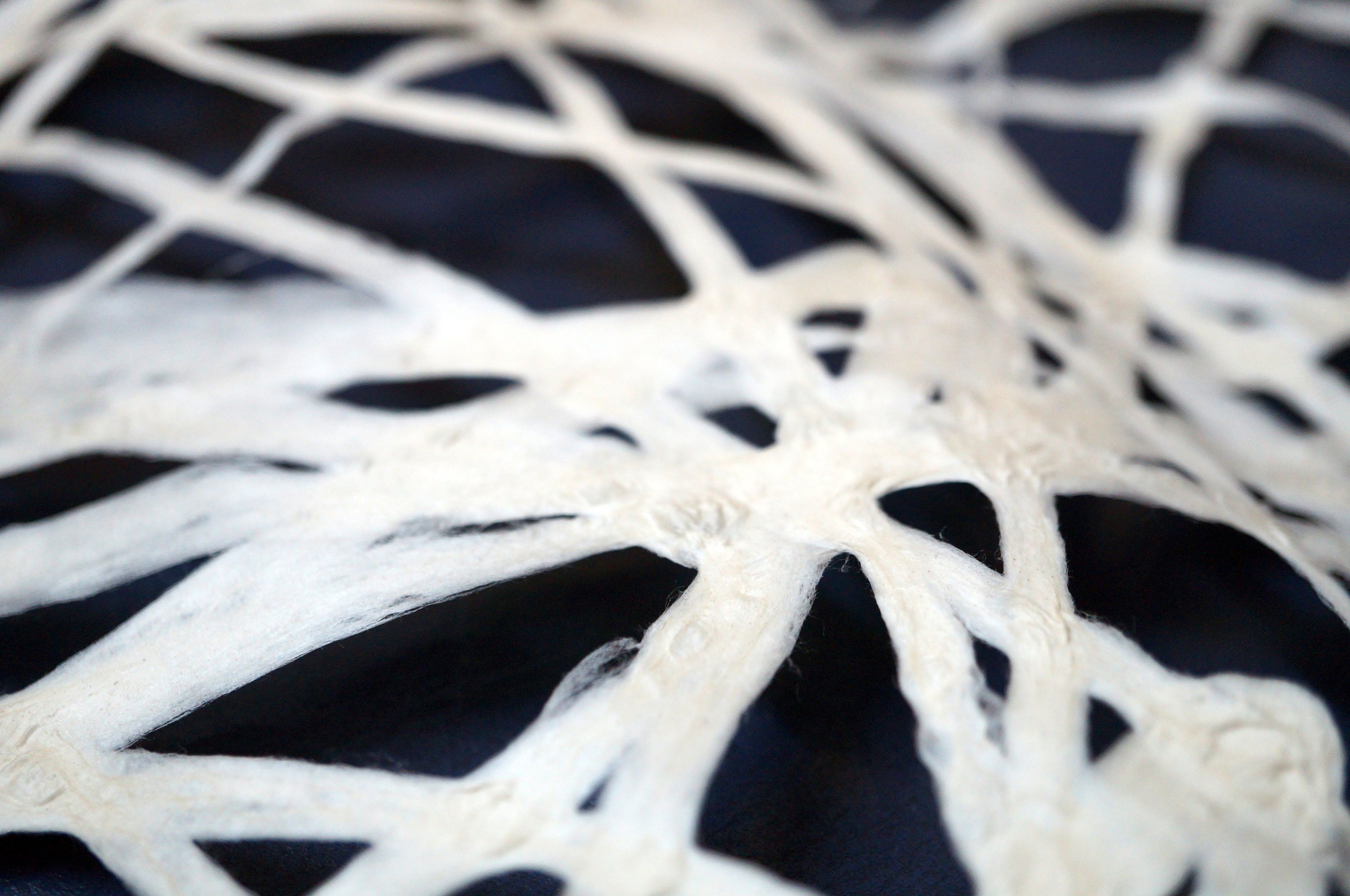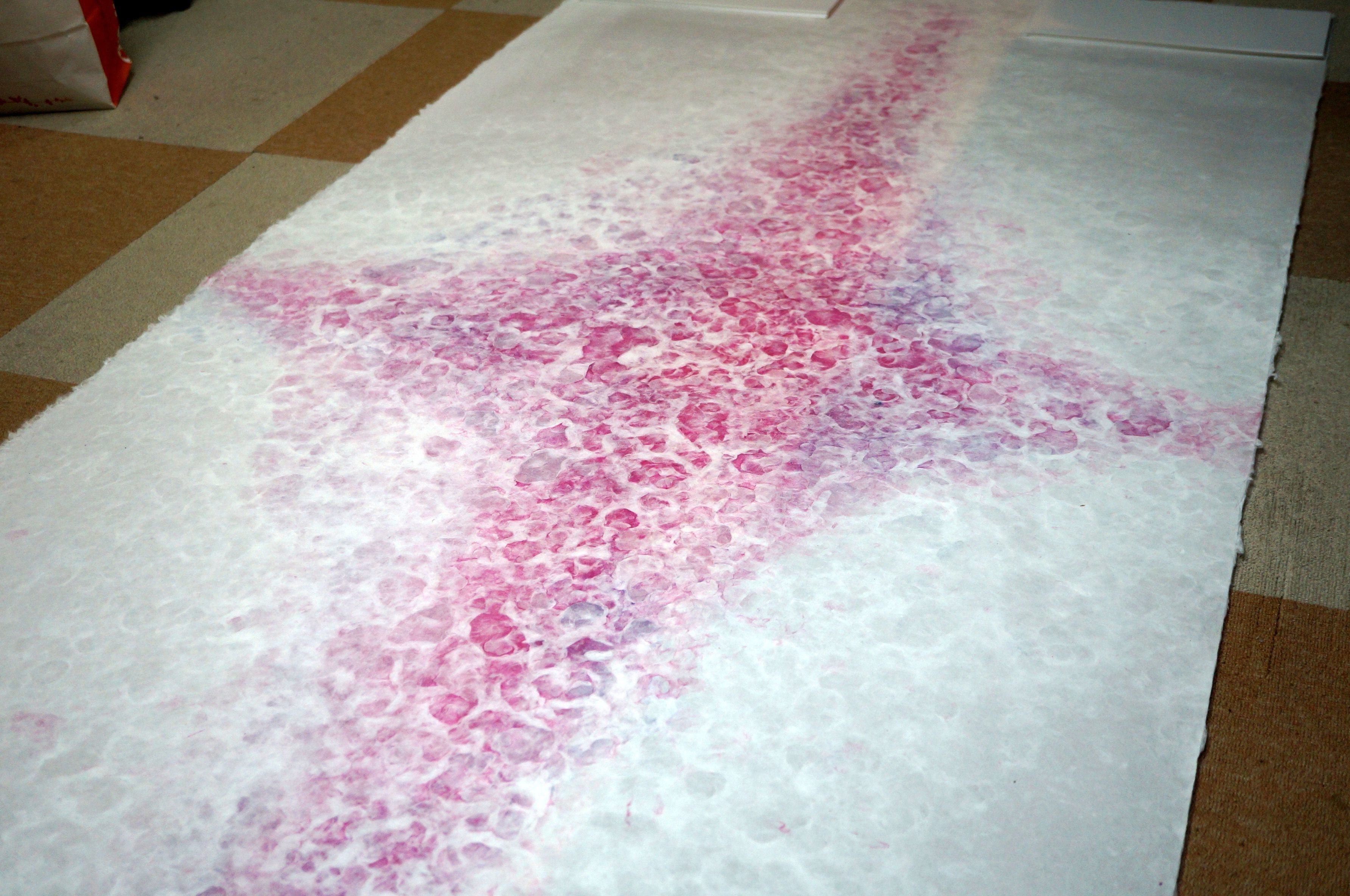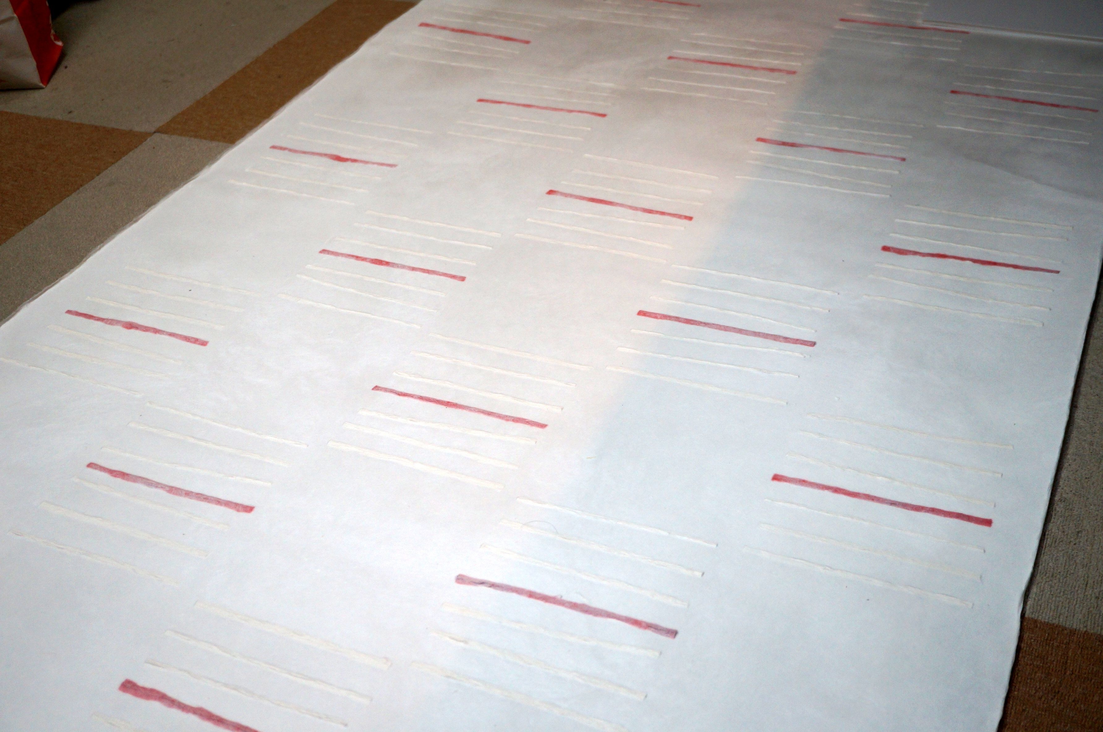 新商品は通常の襖紙の用途ではなく、企業の商業空間を彩るインテリア向けに用途転換し、原料の素材感、光の透け感や陰影、色彩や模様など和紙特有の表現技法に現代的なデザイン表現を組み合わせてアレンジを行い、紙漉き職人の手漉きで作製しているのが特徴です。