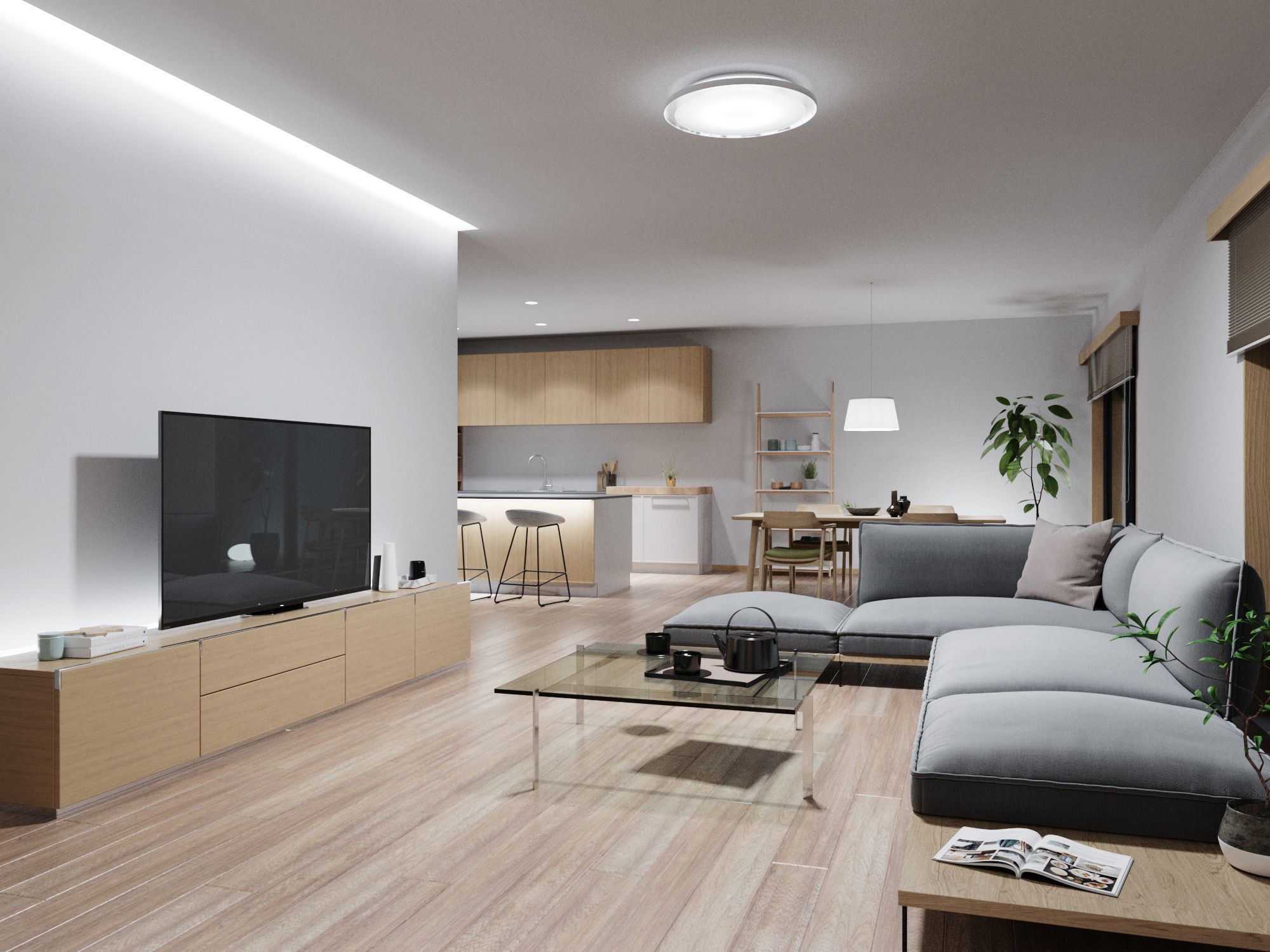 近年、スマートフォン・タブレットが普及し、共働きの増加やテレワークなど働き方の改革が進み、リビングの役割は「テレビ中心のくつろぐ場」から、仕事・勉強・遊びなど「家族それぞれの時間を過ごす多機能空間」へと変化を始めています。シーリング照明器具という1台で部屋を明るく照らす主照明が音声操作可能になり、日常のあかりから特別な演出まで家族それぞれの過ごし方に応じた演出を実現することができます。