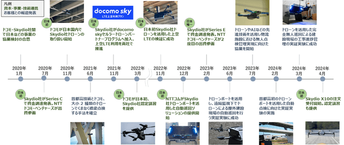 ドコモグループはSkydioと資本・事業面で連携しており、NTT ComはSkydioの一次代理店・Strategic Partnerとして、2020年11月から日本で初めてSkydio製ドローンを提供しています。SkydioはNTT Comの「docomo sky セルラードローンパートナープログラム」(以下 本プログラム)に加入しており、「Skydio X2」では2022年11月に日本で初めて上空LTEを用いた実証実験に成功するなど国内で先行してLTEを活用した実証に取り組んできました。(写真1)