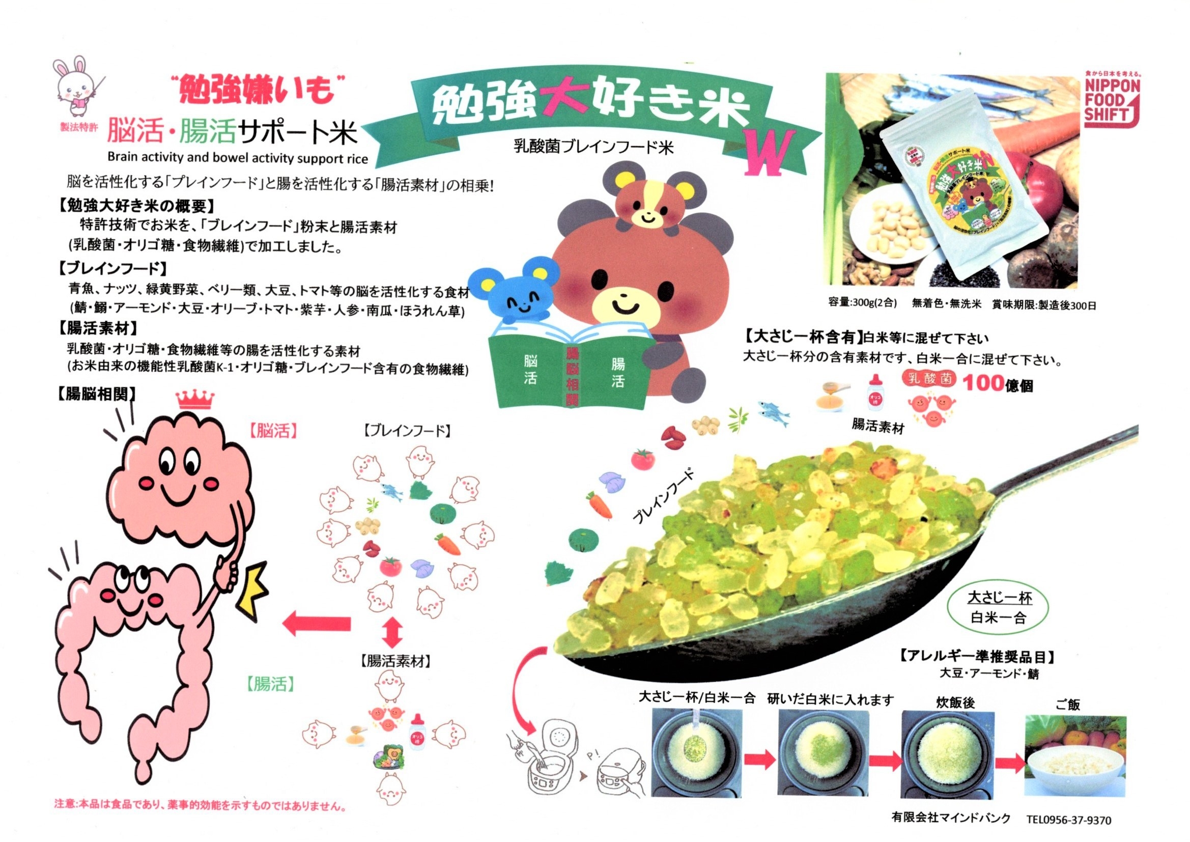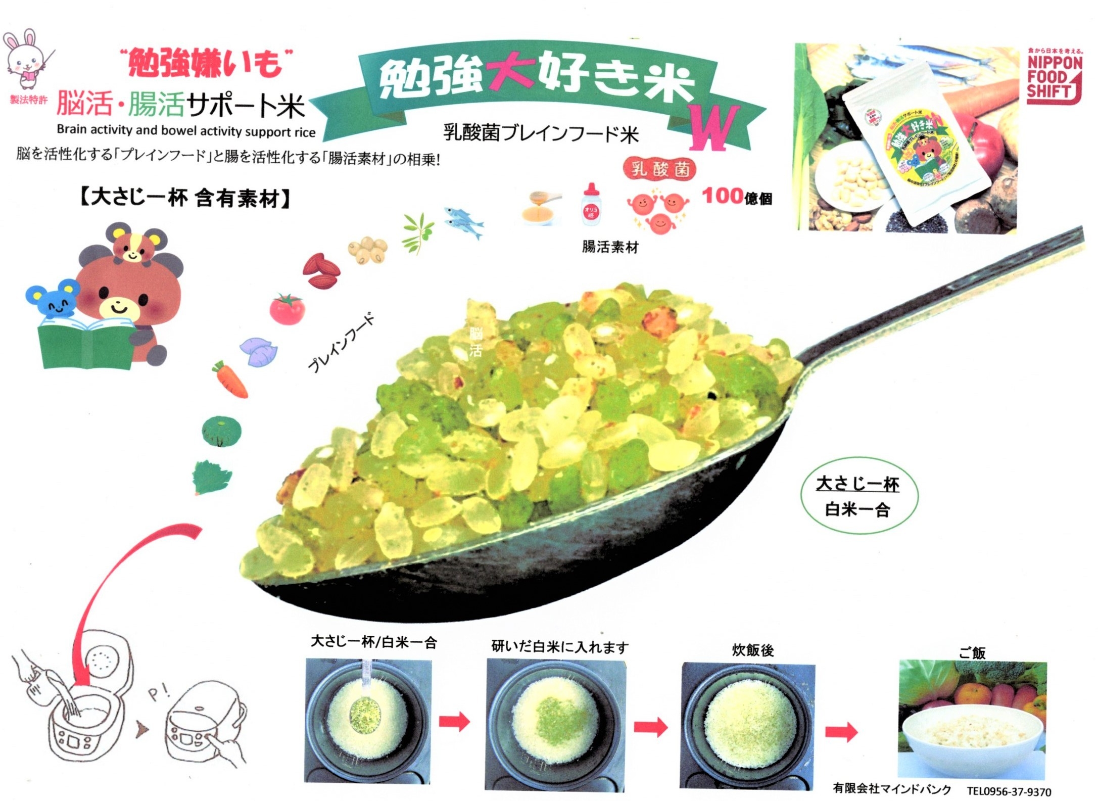有限会社マインドバンク(所在地:長崎県佐世保市、代表取締役:下山 俊雄)は、お米に脳活が期待される「ブレインフード」と腸活が期待される「腸活素材」を融合加工し脳腸相関を期した食品「勉強大好き米W」を開発しました。