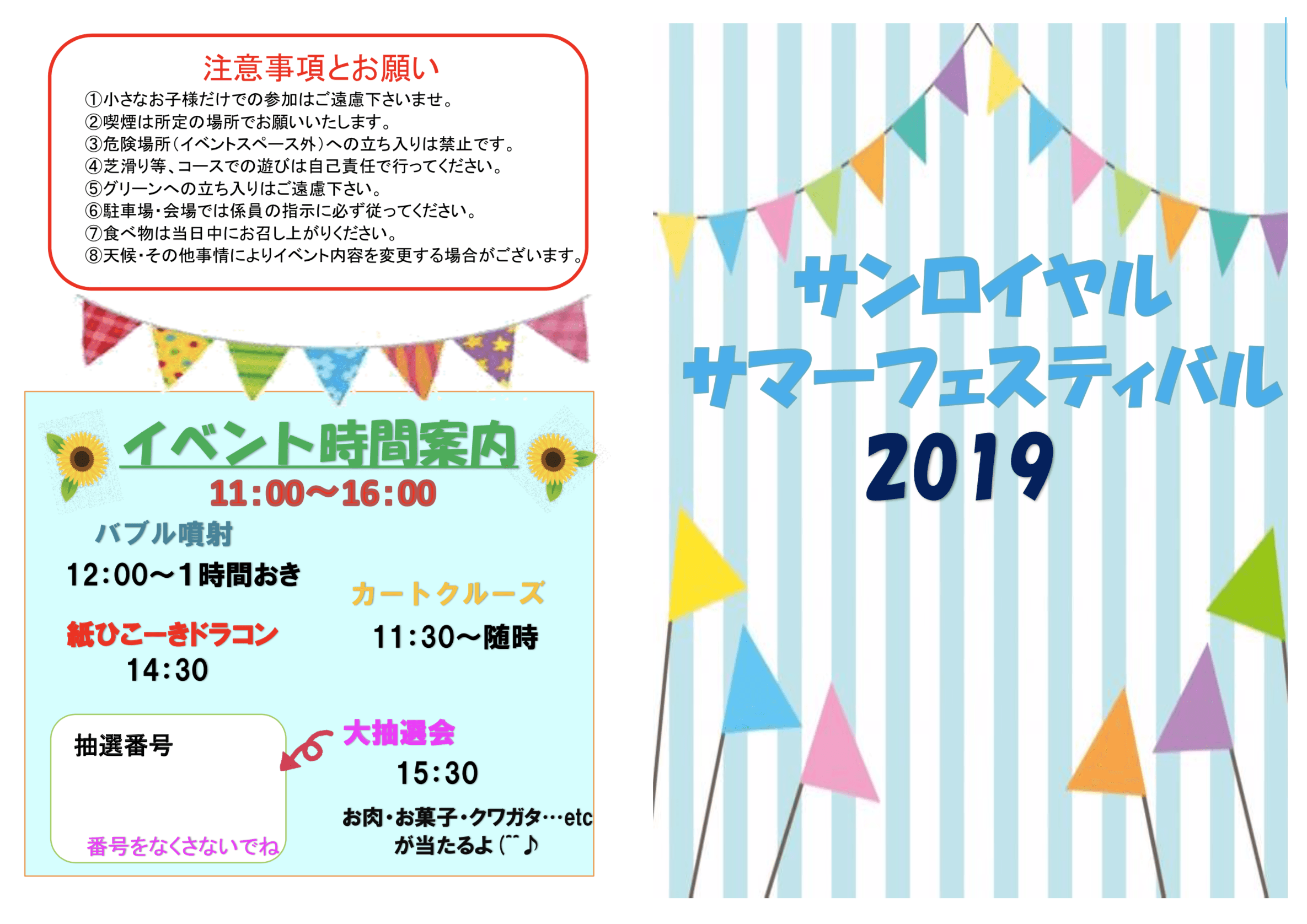 三恵観光株式会社(本社:京都府福知山市、代表取締役:杉本 潤明)は、兵庫県加東市に所有するゴルフ場、サンロイヤルゴルフクラブにて、2019年8月5日(月)にサンロイヤルサマーフェスティバル2019(以下、本イベント)を開催いたします。