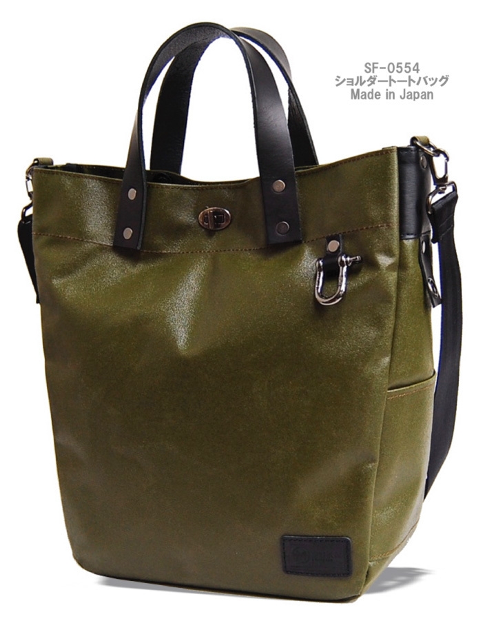 トート型のショルダーバッグは、手ごろなサイズ感と革ハンドルが便利な、他にはないデザインのアイテムです。ヒネリ式金具でサッと開け閉め、シーンによって持ち方を変えられるのも嬉しい機能です。