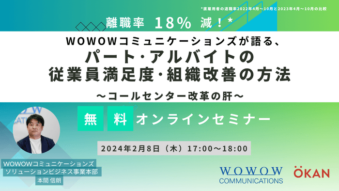 株式会社WOWOW コミュニケーションズ(本社:神奈川県横浜市、代表取締役 社長執行役員:山崎 一郎)は、2024年2月8日(木)に組織サーベイ・組織改善ツールを提供する株式会社OKAN(本社:東京都豊島区、代表取締役 CEO:沢木 恵太)と共催セミナー『WOWOWコミュニケーションズが語る、パート・アルバイトの従業員満足度・組織改善の方法~コールセンター改革の肝~』を開催いたします。