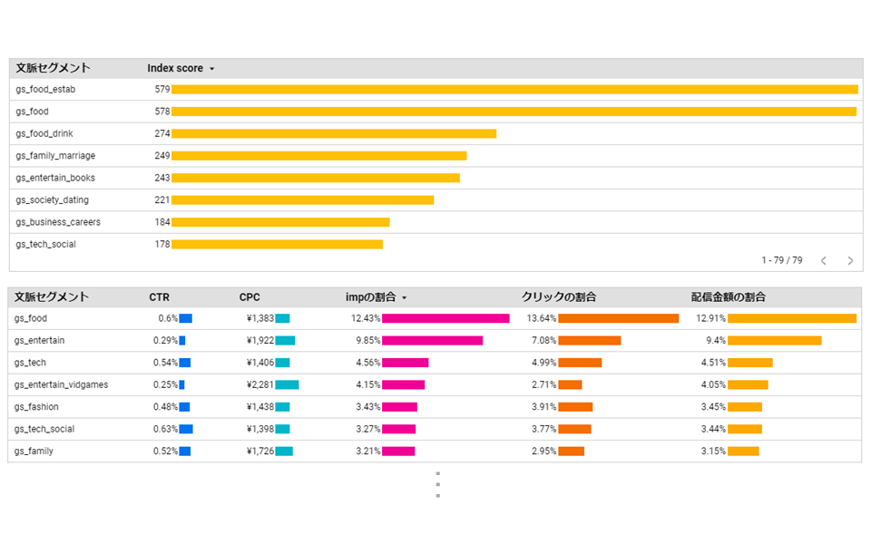 配信結果に対して、各コンテクスチュアルターゲティングの標準セグメント毎に、CTR/CPC/Imp割合/クリック割合/配信金額割合/Index Score(※)