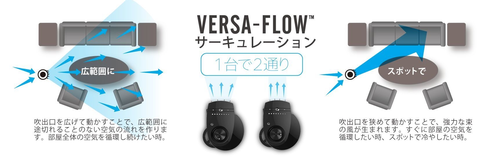 - 風幅を調整できるバーサフロー技術 VERSA-FLOW(TM)
