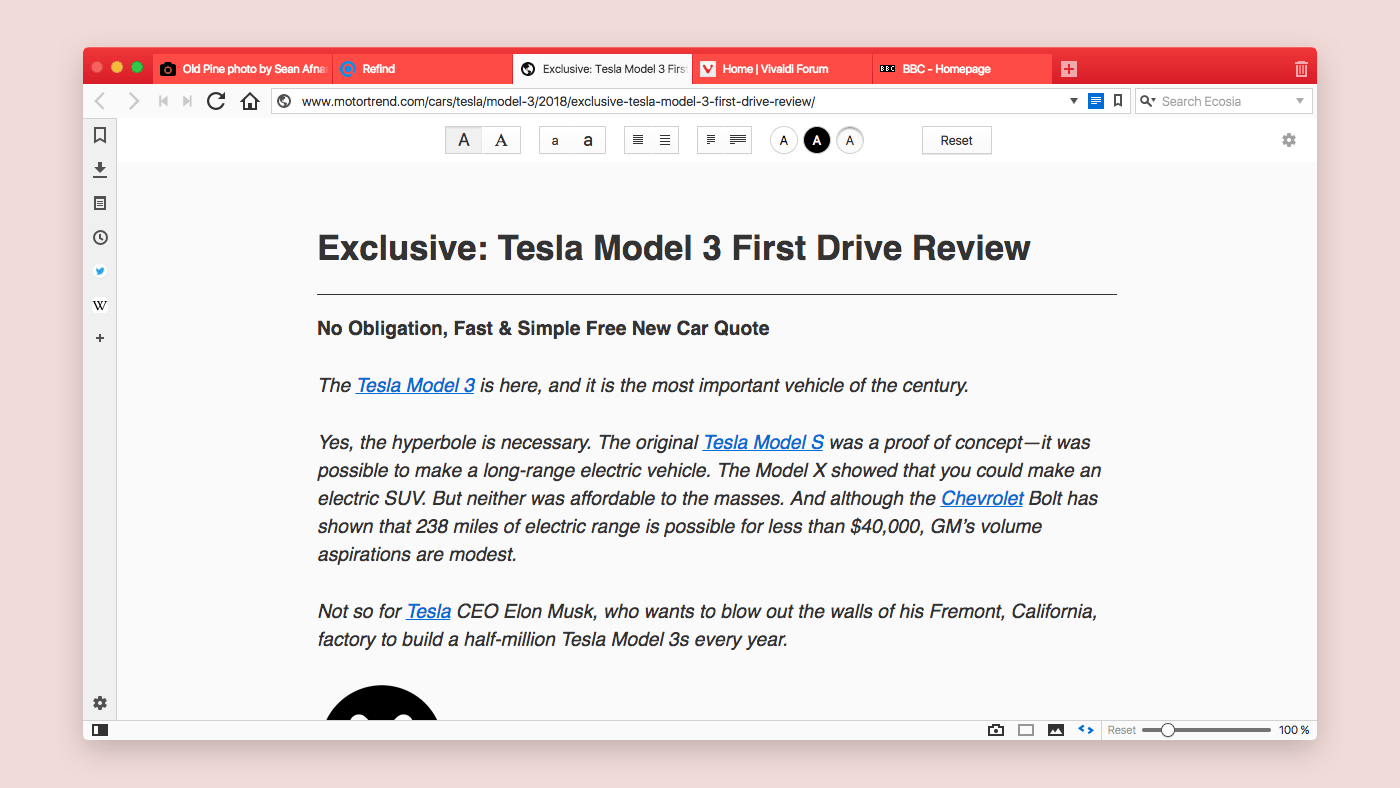 記事をじっくり読みたいとき、Vivaldiのリーダーモードが役に立ちます。リーダーモードをオンにすると、ページ内の望ましくない広告、動画およびその他の要素を非表示にします。