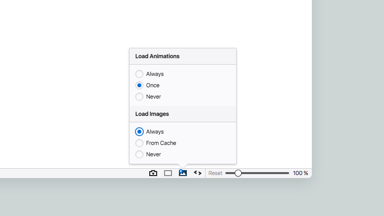 画面下部のステータスバーにある [イメージ] アイコンをクリックすると、アニメーション読み込みに関する3つの選択肢(常時・一度だけ・しない)が出てきます。