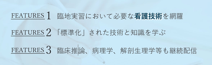本サービスは看護の専門家チームならではの工夫が満載となっています。技術の進歩とともに目まぐるしく変化する医療と看護に対応できるように、技術映像、講義棟を最新情報に常に更新します。より効果的な学習と実践を考えて、複数の視点から確認が必要な看護技術について360度好きな角度で確認できる映像を随時追加!また、看護手順書と必要物品を集約したビジュアルポケットブックの提供等、臨床の現場で役立つコンテンツを提供していきます。
