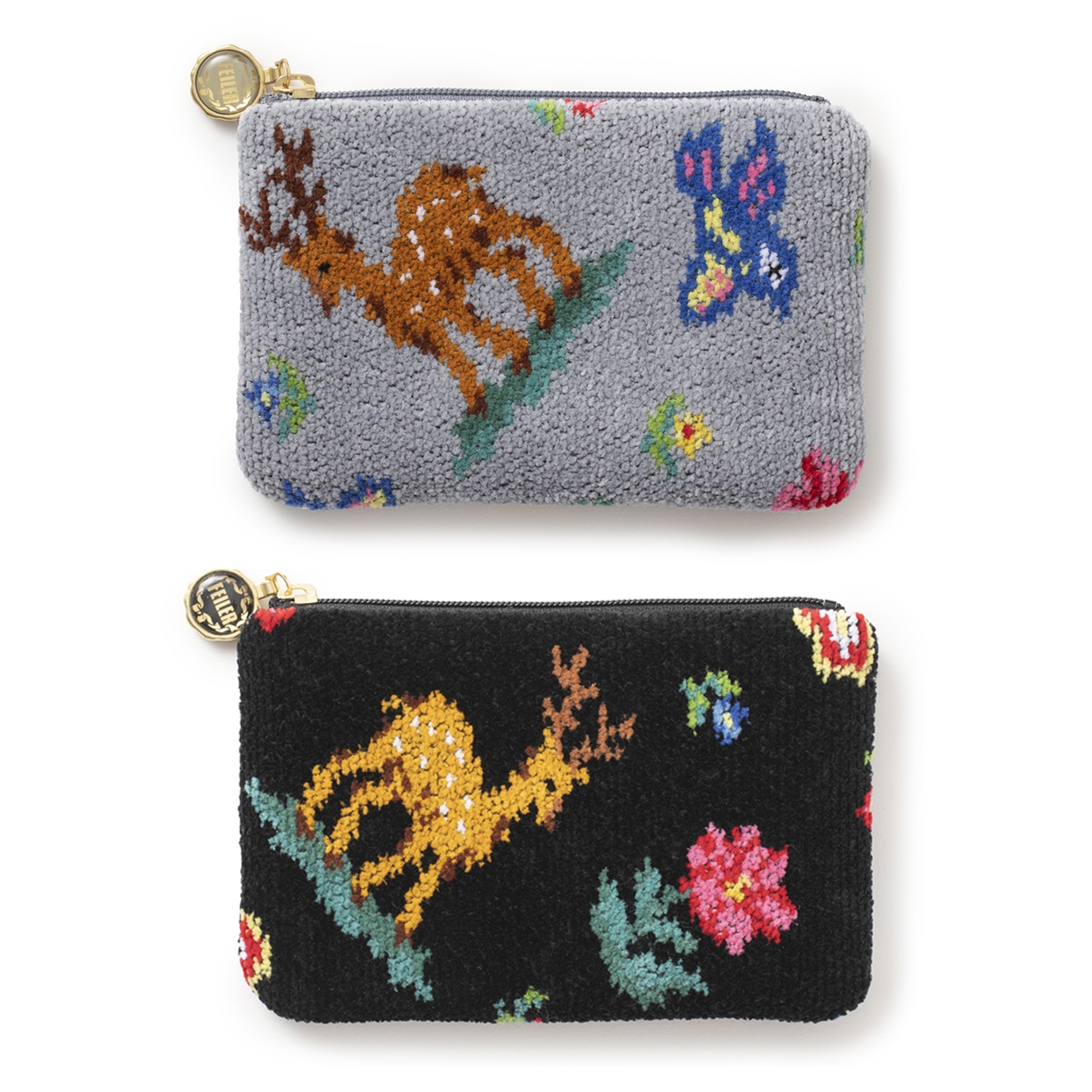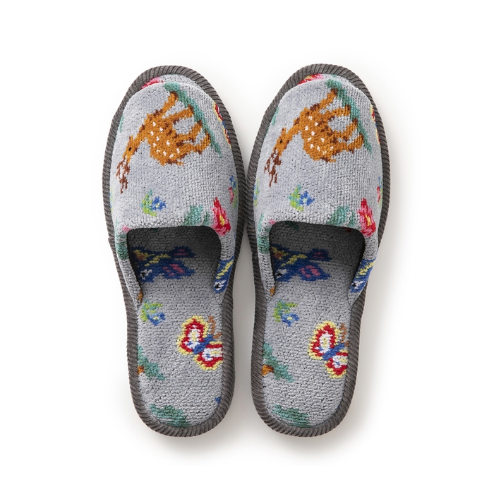 歴史と伝統に彩られたドイツ・シュニール織のブランド「フェイラー」の人気デザイン「ハイジ」をベースに、「遊 中川」のロゴにも使われている鹿や奈良の正倉院宝物に描かれた蝶や植物を、いきいきと鮮やかに織り上げたオリジナルデザインのテキスタイルを制作。