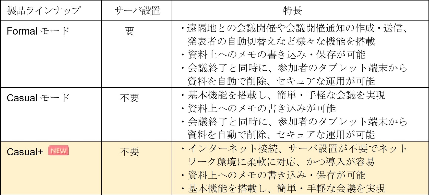 「SONOBA COMET」は、タブレット端末等を利用してペーパーレス会議を実現するシステムで、2012年の販売開始以降、多くのお客様にご利用いただいております。「SONOBA COMET Casual+」は、「カジュアルモード」で実現していたインターネット接続、サーバ設置なしでのペーパーレス会議に加え、お客様からのご要望が多かった「会議資料上に入力したメモ保存機能」と「テキストメモ保存機能」を搭載した、お手軽かつ便利なペーパーレス会議システムです。