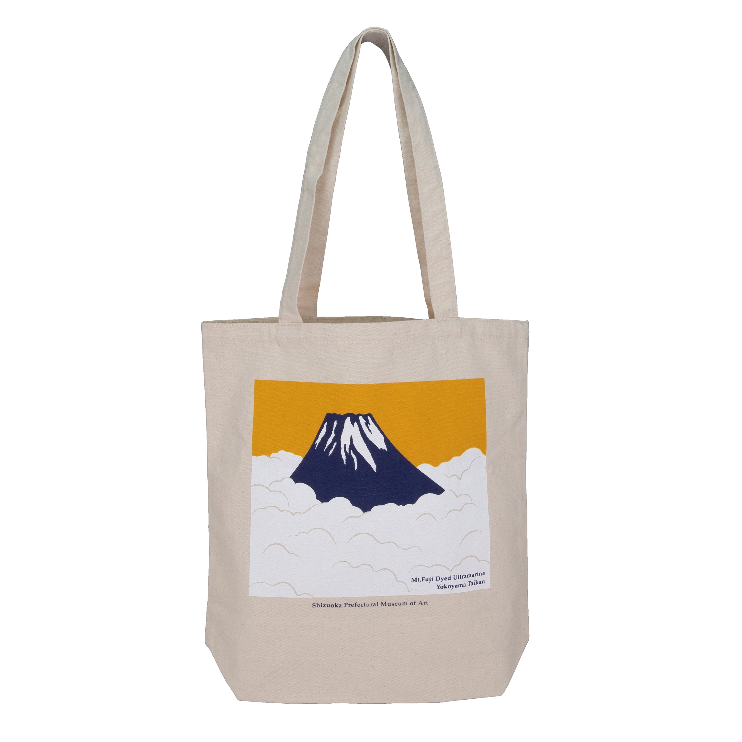 大正から昭和にかけて多くの富士図を描いている横山大観。なかでも静岡県立美術館所蔵の《群青富士》は、簡潔な構図のうちに、躍動感と装飾性を示す近代的な富士図として、一際高い評価を受けています。金地に山肌の群青と残雪や雲の白が生える、美しい作品を、シルク印刷3色で表現しました。特に湧き立つ白雲の再現にこだわり、作品から受ける清々しい初夏の富士の印象を大切にしました。美術館観覧、そして静岡旅のお土産にもぴったりのトートバッグです。