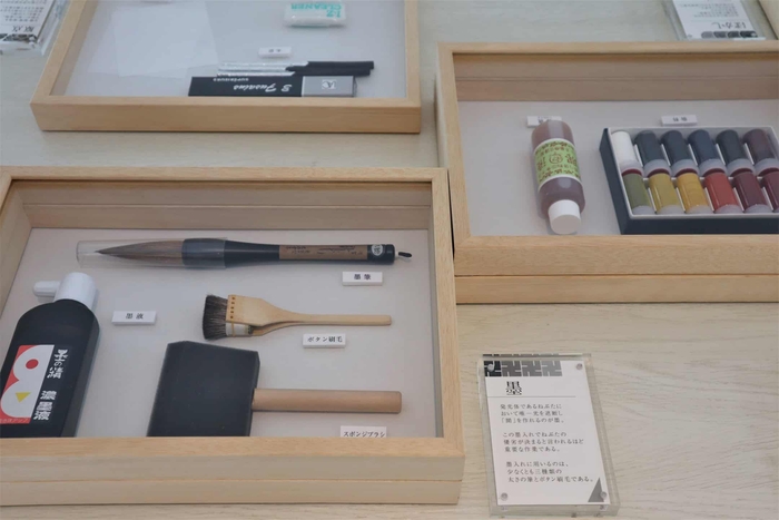 今回新たに、絵師が実際に使用している、筆や墨、粉末染料などの道具を展示しています。筆一つとっても下絵で使用するもの、蝋付けで使うもの、色付けするもの等、制作のプロセスによって太さや形状の異なる筆を多数使い分けていることを知ることができ、絵師の作業に思いを馳せることができます。