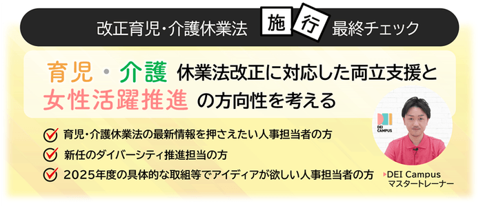 育児・介護休業法や次世代法の改正ついて両立支援の概念や構造から理解することで、DEI推進の取り組みにつなげやすくします。