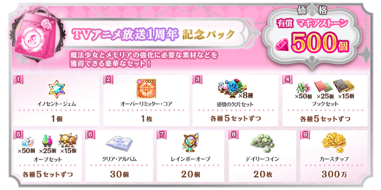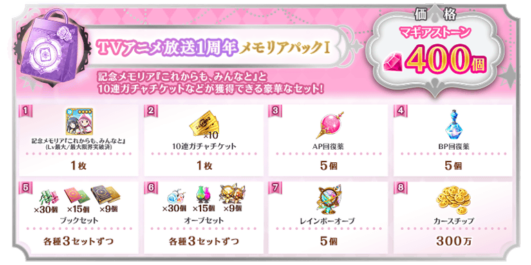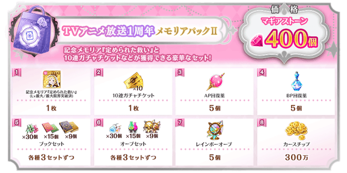 ※「TVアニメ放送1周年記念パック」「TVアニメ放送1周年記念メモリアパックⅠ」「TVアニメ放送1周年記念メモリアパックⅡ」のご購入はおひとり様1回までです。