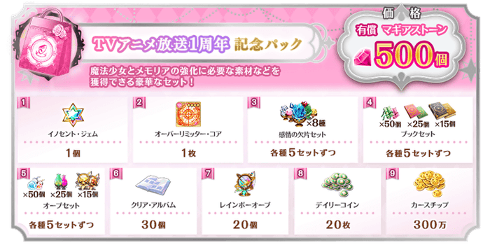 各STEPに応じて、消費する有償マギアストーンの個数や、獲得できるおまけが異なり、STEP5では対象の★4魔法少女1体や★4メモリア1枚と交換できる「アニメver.魔法少女SPチケット」が獲得できます。