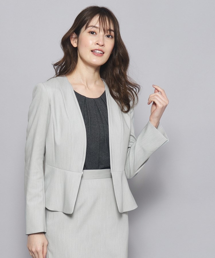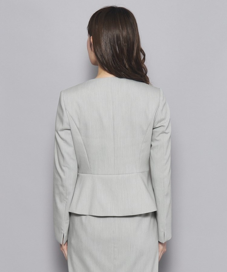 ウエストから裾にかけての柔らかく、女性らしいペプラムシルエットと細く繊細な二枚重ねの切り替えラインに拘ったジャケットに仕上げました。