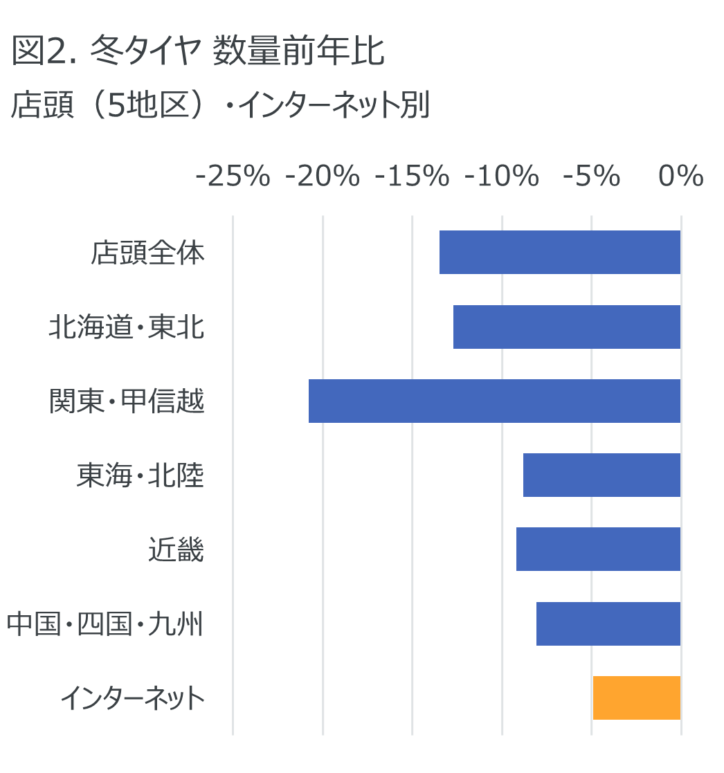 冬タイヤの2023年9-12月期の数量前年比は全体で10%減と二桁マイナスとなった。店頭では数量前年比14%減、特に関東・甲信越では同21%減と前年を大幅に割り込み、インターネットでは同5%減であった(図2)。冬タイヤの最盛期である12月の販売が、数量前年比25%減と著しく減少したことが影響した。冬タイヤの平均価格は店頭では13,123円と前年から7%上昇したことに対し、インターネットではプレミアム製品の構成比が下がったことが一因となり、11,682円と1%下落した。金額前年比は店頭では8%減、インターネットでは2%減となった。