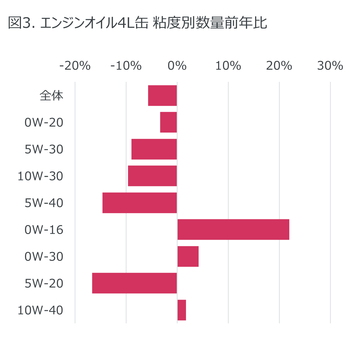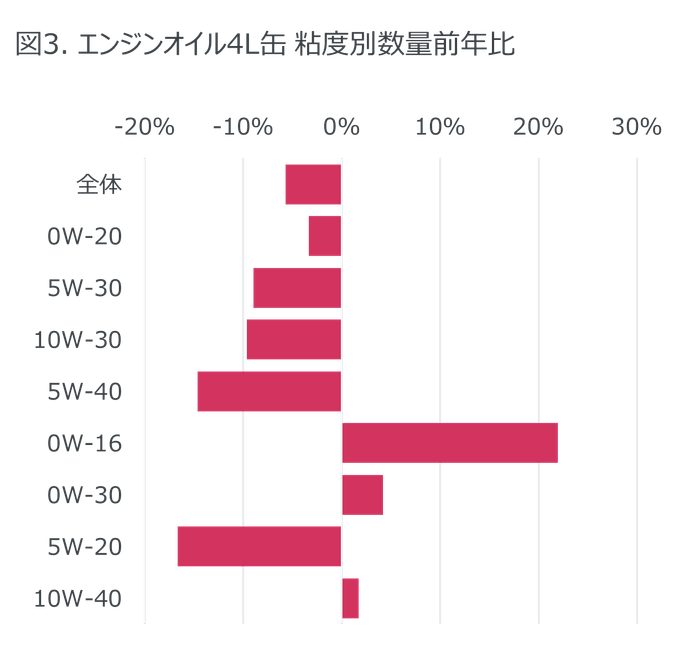 4L缶の主要な粘度では、0W-20が数量前年比3%減、5W-30が同9%減、10W-30が同10%減と減少した(図3)。そうした中、0W-16は数量前年比22%増と二桁成長を見せた他、0W-30は同4%増、10W-40は同2%増と前年を超える粘度も見られた。