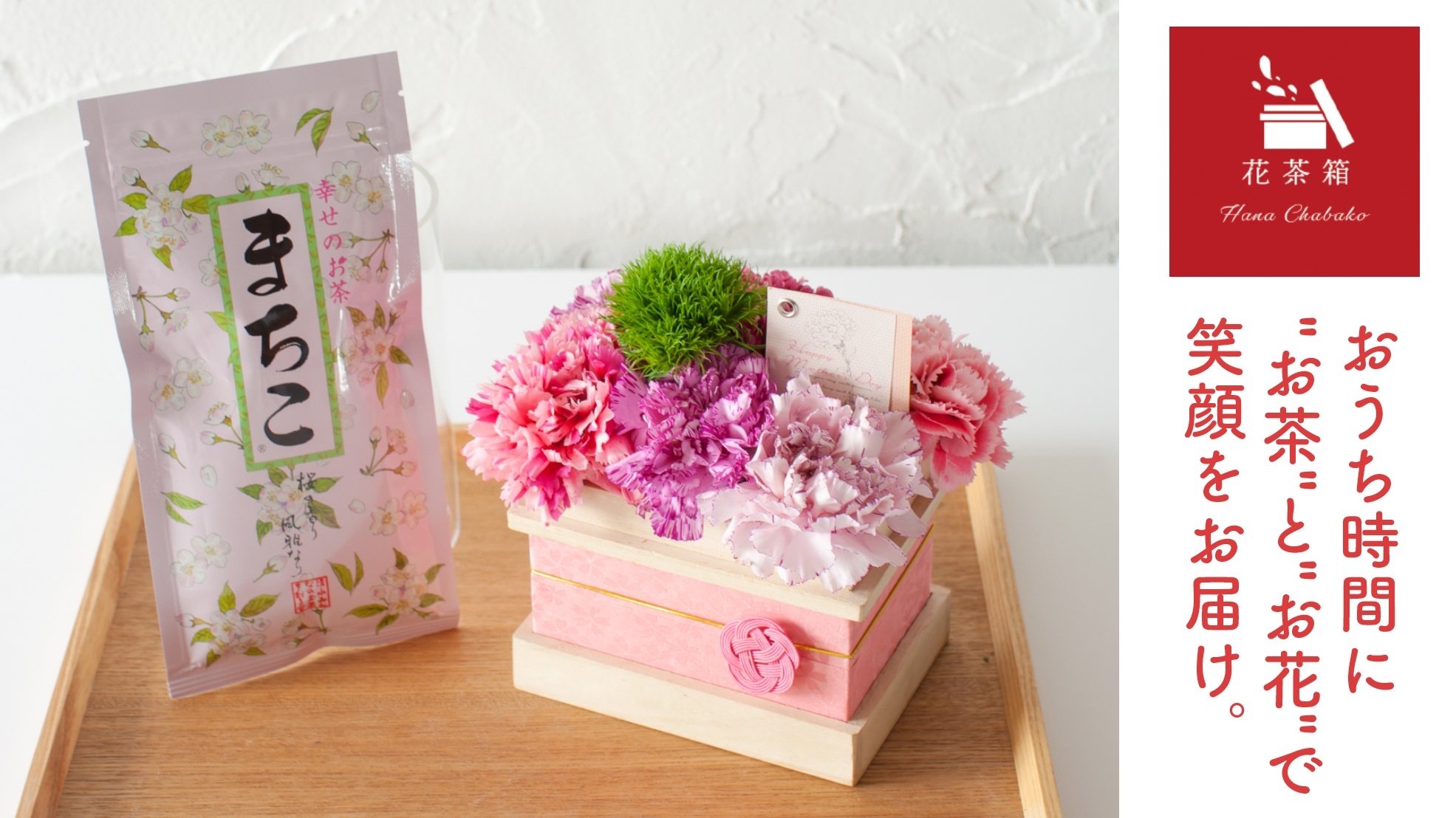 定番のカーネーションアレンジメントのセットだけでなく、手のひらサイズのミニ茶箱にお花をいっぱいに詰め込んだサプライズギフトがセットになった商品がございます。蓋を開けるとミニ茶箱いっぱいのお花で思わず笑顔に、セットのほんのり桜の香りがする茶葉 幸せのお茶まちこで、幸せなおうち時間はいかがでしょうか?
