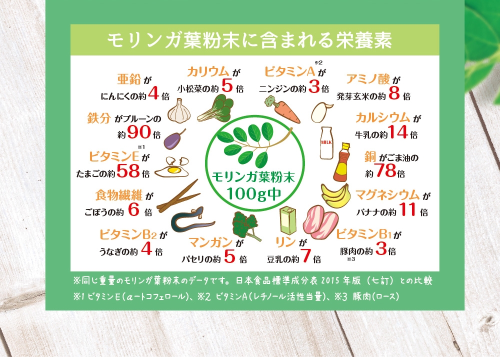 栄養素の種類だけではなく、内容量も豊富なのがこのモリンガの特徴です。
