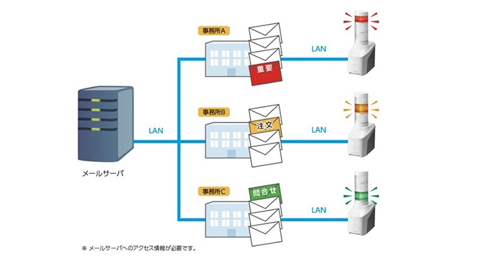 ネットワーク制御信号灯「NHVシリーズ」は、重要なメールを受信した際に光と音声でお知らせすることが可能です。光と音声による見える化で、重要メールの見落としによる対応遅れの防止や、メールの常時監視が必要な作業者の負担を軽減することができます。