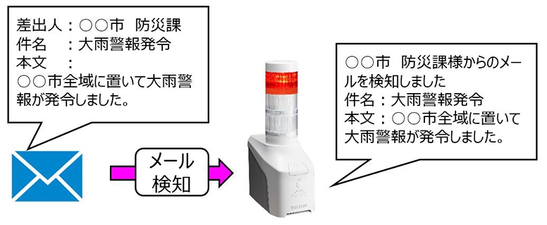 検知したメールの本文に含まれる制御タグによって信号灯を制御する、音声を再生することができます。特定のコマンドをメール本文にあらかじめ登録しておくことで、メール着信を検知してコマンドの実行が可能になります。