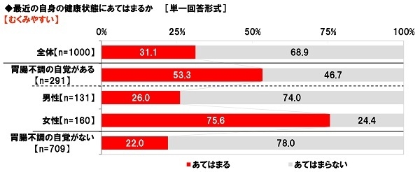 全回答者(1,000名)に、心身における変化や不調の症状を挙げて、最近の自身の健康状態はそれらの症状にあてはまるかを聞きました。そしてさらに、胃腸不調の症状の自覚別に回答結果を比較しました。