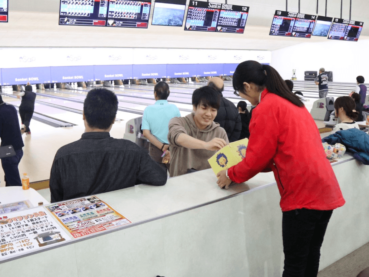 ストライク募金とは、ストライクをとられた方にご好意でいただく募金です。ストライクをとられた方は手を振って、募金箱をもったスタッフを呼んでくださっていました。