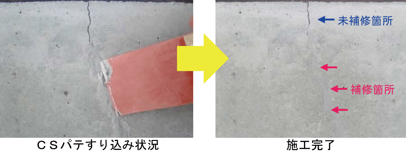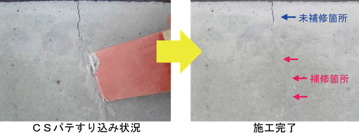 CS-21クリアーは、ひび割れ部に浸透させることによりコンクリート表層部を緻密化させ、ひび割れ自閉効果を促進します。