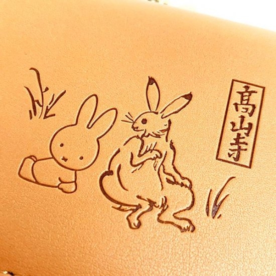 キャメルカラーが上品でシックな、コンパクト財布です。表面には、ミッフィーと鳥獣戯画のデザインが。
