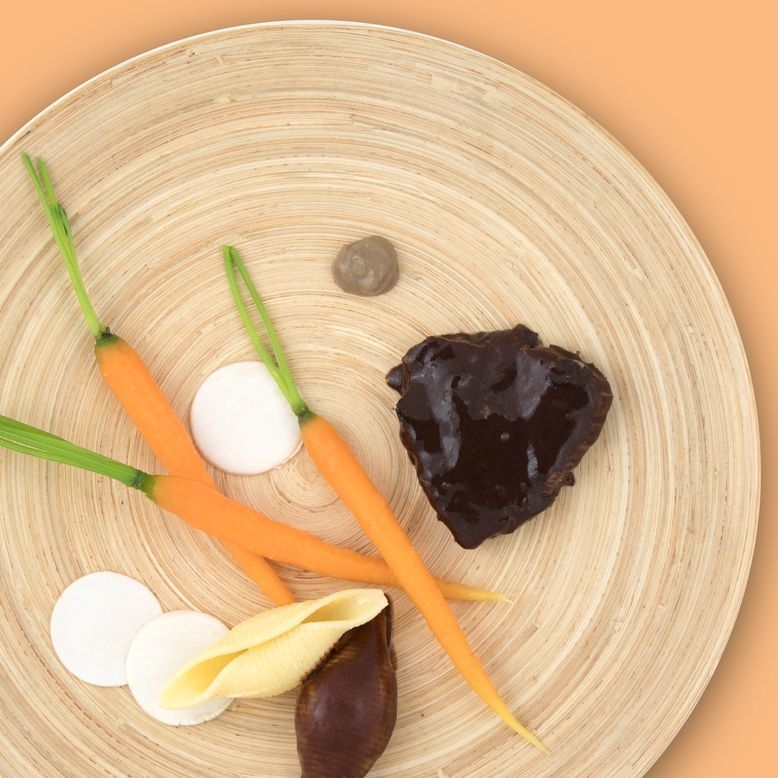 ・アンチョビ風味のビーフ、貝のパスタとニンジン、キノコ添え